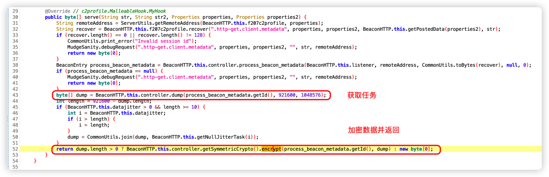 元数据本身则通过 RSA 公钥加密,这样 C2 就和 Beacon 完成了秘钥协商,接下来通过检查任务列表中是否存在任务,存在任务则下发任务,Beacon完成任务之后,通过POST返回执行之后的结果。