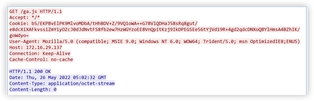 从流量中来看,第一个数据包直接传输 CS 的 Beacon,并且没有加密流量,因为 Beacon本身就是需要自解密的。
