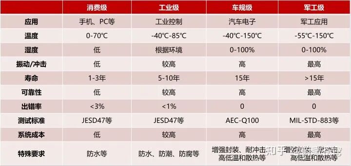 芯片按照典型应用场景,通常可以分为消费级、工业级、车规级和军工级四个等级,其要求依次为军工>车规>工业>消费。