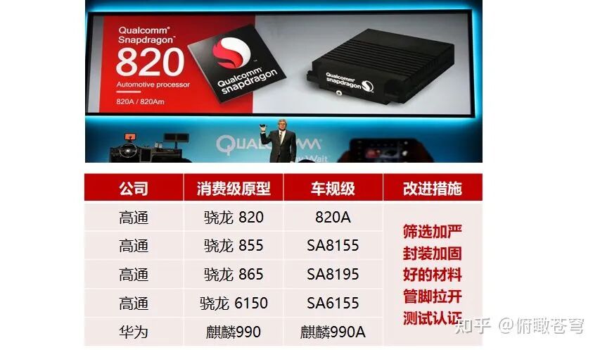 高通车载方案就是把手机芯片通过筛选加严、封装加固、管脚拉开、AEC-Q100认证等方式增加车载规格,如820A/ SA6155/ SA8155/ SA8195都能找到消费级手机芯片的原型。