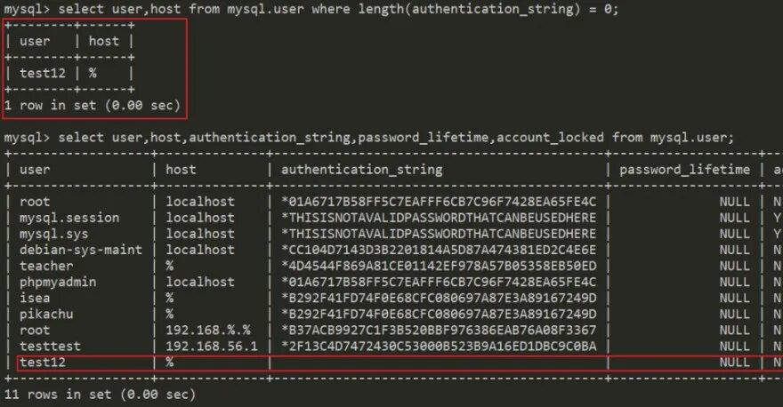 select user,host,authentication_string,password_lifetime,account_locked from mysql.user;