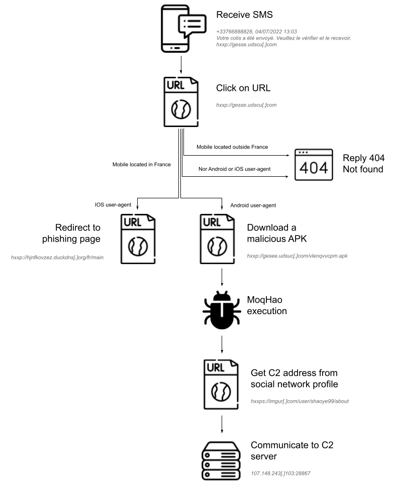 近日,研究人员披露APT组织Roaming Mantis近期针对法国的攻击活动。攻击者通过发送嵌入恶意URL的钓鱼短信,诱骗受害者下载Android恶意软件XLoader(MoqHao),或将受害者重定向到用于窃取Apple凭据的钓鱼页面。目前,已监测到超过90000个IP地址从恶意C2服务器请求XLoader。下图是攻击流程图。