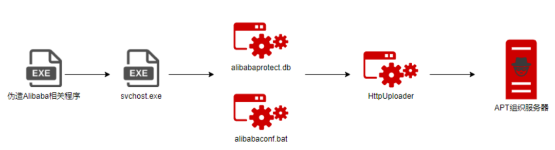 组织利用伪造Alibaba相关程序并注册服务实现伪造组件的持久化,涉及伪造组件alibabaprotect.db、alibabaconf.bat,伪造组件释放后续载荷HttpUploader,实际主要为根据载荷参数上传用户特定目录下文件信息。值得注意的是连接C&C地址与上传目录均以参数形式传递至伪造组件,以达到关键信息与载荷分离目的。