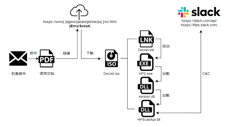 近期,奇安信威胁情报中心红雨滴团队在日常的威胁狩猎中捕获到EnvyScout攻击样本,该样本释放的ISO文件中包含LNK文件以及设置了文件隐藏属性的PE文件,通过LNK文件启动其中的正常EXE,进而以侧加载方式执行恶意DLL。恶意DLL利用团队协作通信服务Slack作为C&C信道,获取后续载荷并执行。