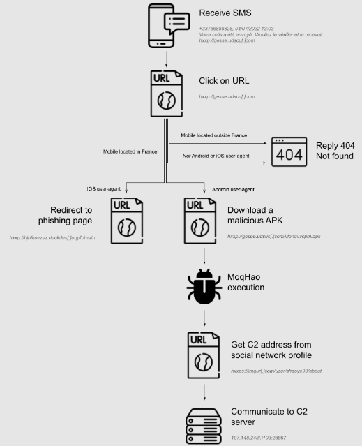 近日,研究人员发现一起网络钓鱼活动,该活动通过嵌入网络钓鱼短信的恶意URL,部署MoqHao Android恶意软件,或重定向到Apple登录详细信息凭据收集页面。经分析该活动归因于Roaming Mantis组织。