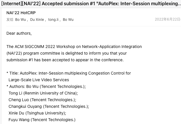 ②审稿人评价:“本文提出的 AutoPlex是一种基于会话间信息复用的拥塞控制框架,能够使用最佳性能流的网络QoS 指标(之间的相似性)来自动配饰拥塞控制参数。另外,AutoPlex架构支持用户定义的优化目标,可以作为学习标准来提取性能更好音视频会话的网络QoS 特征。”;“作者还实现了基于QUIC协议和BBR的AutoPlex解决方案及性能评估。”;“论文的另一个重要贡献在于面向音视频业务提供了大规模的网络流量测量。”