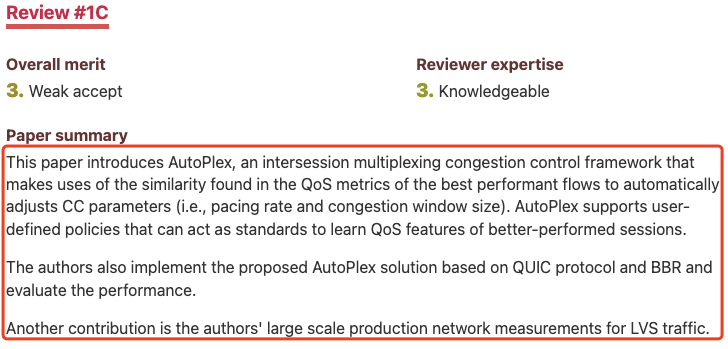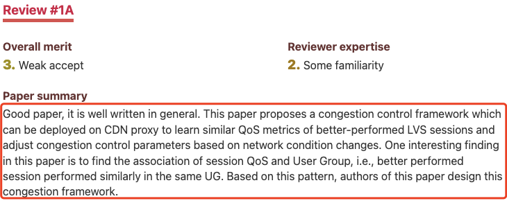 ①审稿人评价:“这是一篇高质量论文!本文提出了一种可以部署在CDN代理上的拥塞控制架构,该架构可以学习‘表现较好’的音视频会话,并根据网络状态的变化自适应调整拥塞控制参数”;“音视频会话QoS与用户群组的关联关系是本文的重要发现,在同一个用户群组中,表现较好的音视频会话具有相似的网络QoS与参数特性。”