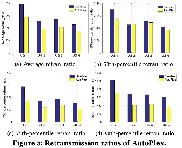 AutoPlex已在多个腾讯自研业务中部署使用,并在第三方视频直播业务中进行大规模灰度测试,实验结果表明AutoPlex可优化24%-27%的平均重传率和14-32%的平均有效吞吐时延比。