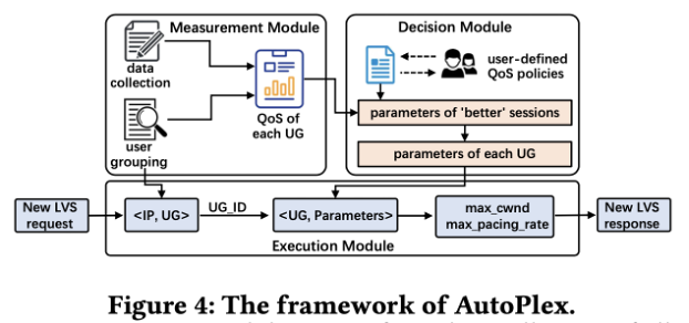 AutoPlex自适应拥塞控制架构包括测量模块、决策模块和运行模块。其中测量模块主要负责执行面向用户群组的周期性网络QoS统计;决策模块可接受用户自定义的网络QoS优化目标,并筛选出那些“表现较好”音视频会话的网络QoS及拥塞控制参数值,最后为每个用户群组自动化配置相应的拥塞控制策略;执行模块负责根据用户请求,获取其对应用户群组的参数配置信息,并实现对该音视频会话流量传输的自适应拥塞控制。