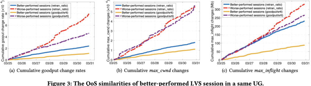 (4)在同一个用户群组中,相邻周期中那些“表现较好”的音视频会话在性能指标及拥塞控制参数等方面具有一定的相似性。团队提取了一周时间范围内音视频会话的相关网络QoS数据,如图3所示,相邻时间周期之间那些“表现较好”的音视频会话在有效吞吐量、最大发送窗口、最大在途数据量等指标上具有一定的相似性。