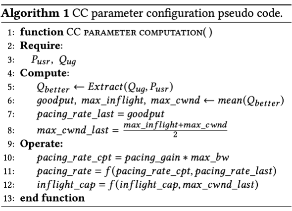 AutoPlex自动化复用相邻时间周期的音视频会话信息,实现对每个用户群组拥塞控制参数(如发送窗口与发送速率等)的自适应配置,在充分适应动态化的网络状态与差异化的网络条件的同时,有效地保证了流量传输控制的准确性与稳定性。算法1展示了AutoPlex架构在实现发送窗口与发送速率精确控制的相关细节。