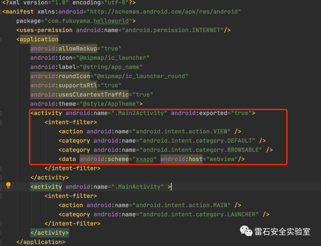 在AndroidManifest.xml中注册并配置两个活动。其中Main2Activity中定义了对应的url。