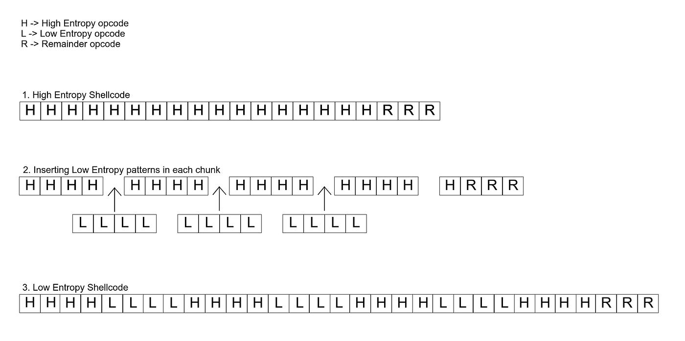 BYTE lowEntropyShellcode[sizeof payload * 2 - remaining_bytes] = {0}; // array of bytes size calculation to contain the original high entropy code plus the low entropy inserts