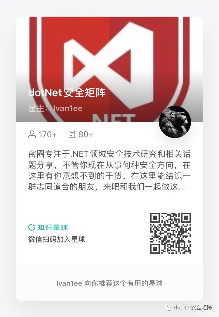 相信通过本文介绍大家对.NET下的Unicode编码绕过有了初步的认知,由于Unicode通用性极强,所以其他语言诸如Java、PHP也会受其影响。下一篇将继续分享 .NET 免杀Trick,请大伙继续关注文章文章涉及的工具和PDF已打包发布在星球,欢迎对.NET安全关注和关心的同学加入我们 [dotNet安全矩阵] ,在这里能遇到有情有义的小伙伴,大家聚在一起做一件有意义的事。