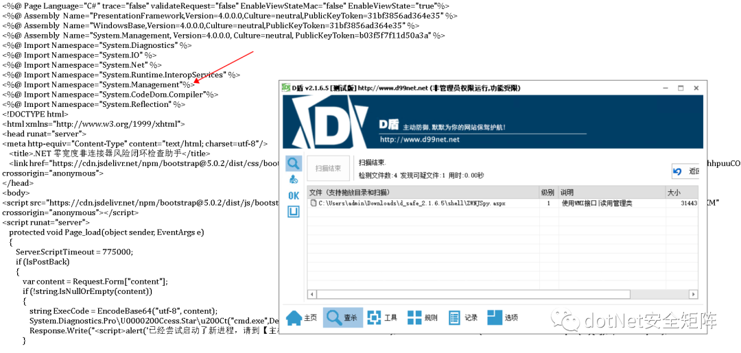但笔者之前写的风险检查助手却被D盾识别为1级可疑文件,从说明可知 WMI查询接口视为敏感操作,经过多次对比筛选后发现引入的命名空间System.Management被当作恶意特征,如下图