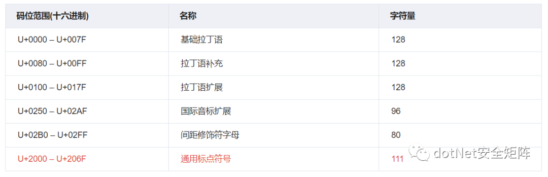 BMP中有一块内容是通用标点符号,码位范围 U+2000 – U+206F ,这个区域分配了111个字符,我们需要关心的字符大约有10个,这些基本都是非打印不可见的字符,可被利用拆解代码里敏感的类名或方法名