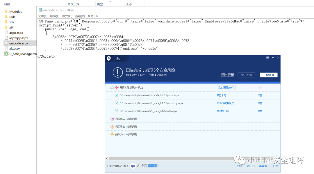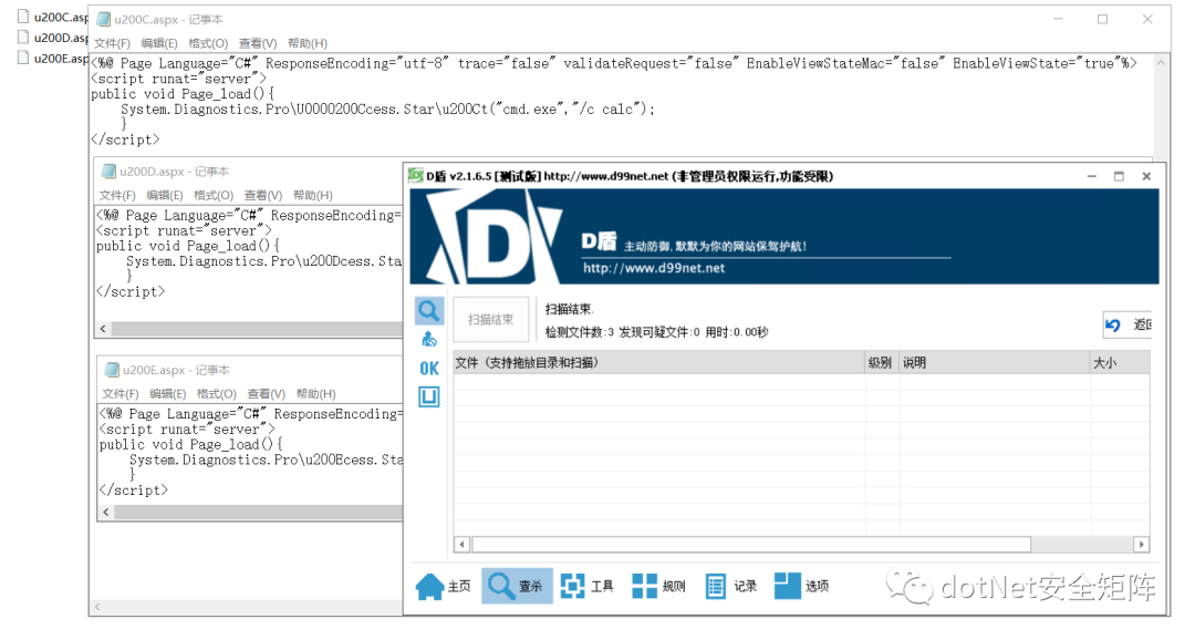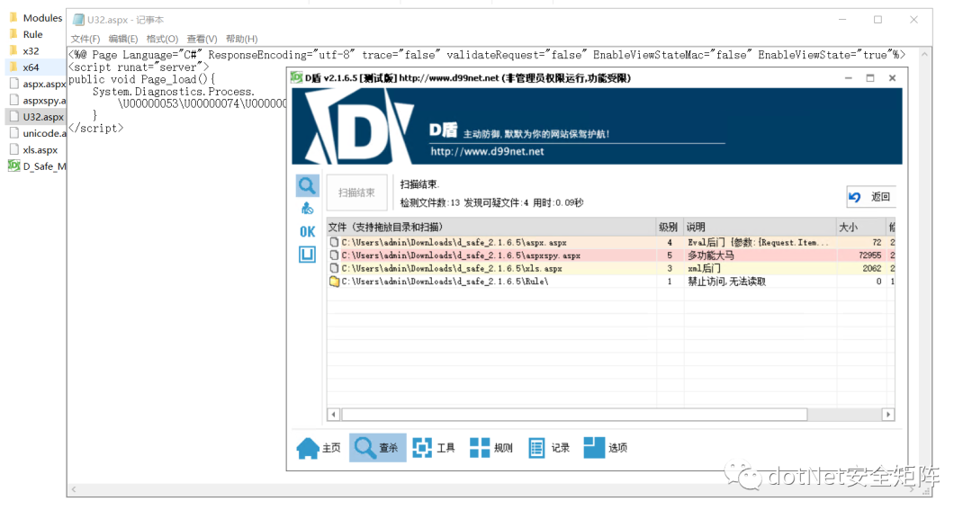 分别用安全狗和D盾测试免杀效果,同目录下还有另外3个文件,aspx.aspx 是经典Jscript一句话木马,aspxspy.aspx 看文件名就知道是经典大马,xls.aspx 是基于xml文档实现的小马,对比被杀的3个Webshell,Unicode编码后的webshell免杀效果非常理想,如下图unicode.aspx