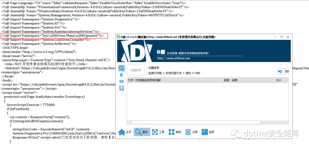 Unicode 的编码空间为 0xFFFF - 0x10FFFF,那可以想到的最简单的办法就是让每个码位对应一个 32 位 (4 bytes) 二进制数,这就是 UTF-32 编码。所以在 UTF-32 中,每个字符占用 4 个字节,它是一种定长编码格式,使用32位表示Unicode中的一个码位。由于Unicode的码位实际只用了21位,所以多余部分前导0。例如字符小写字母a,对应码位为\x61,存储的字节序列为:\x00000061。如下代码保存为U32.aspx,尝试用D盾扫描,只扫出上述3个经典webshell,并未检测出UTF32编码后的恶意样本