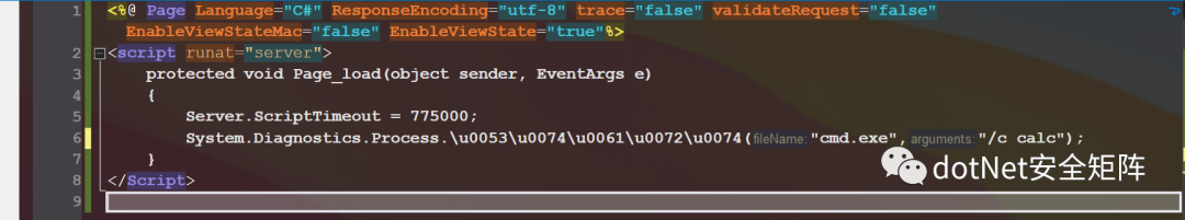 还可以对完全限定路径做编码,注意 . 不能编码为 \u002e,否则编译器会抛出异常,如下编码 System.Diagnostics.Process.Start,即使换行也不影响运行