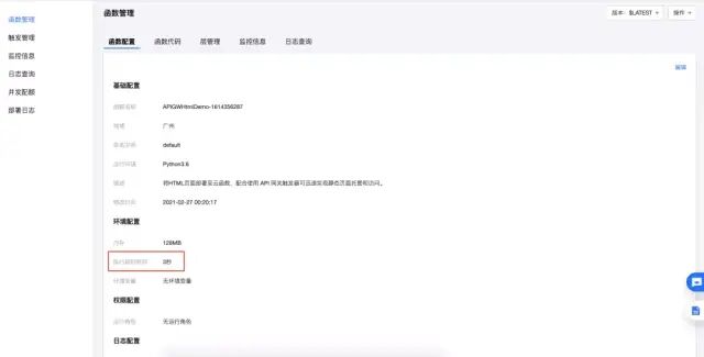 在函数管理 - 函数配置里面,最好把执行超时时间设置成和蚁剑里面的超时时间一样或者更长。