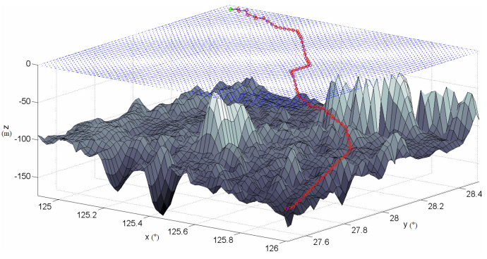 随着技术的快速发展,已经可以测量洋流强度和方向,并利用数据统计进行预测。然而,在考虑到洋流的路径规划方法中,当洋流强度较大时,存在以下几点问题:容易导致所规划的路径不可达、容易产生错误路径等。并且,有些方法仅限于二维环境下的应用。