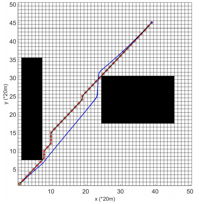 2)与人工神经网络的对比:为了进一步解释动态神经网络模型与人工神经网络的区别,引入人工神经网络(ANN)模型,在无洋流的简单的障碍物环境中与动态神经网络模型进行对比。图7中,蓝线表示ANN的路径,黑线表示动态神经网络模型的路径。ANN的路径距离为1195.1米,而动态神经网络的路径距离为1194.8米。在本文的实验中,ANN需要超过300次的迭代才能形成可行的路径。因此,尽管它也可以规划较短的路径,但它只适合于静态环境。此外,在复杂的障碍物环境中,它有时可能会收敛到局部最小值。