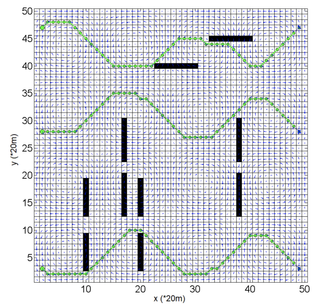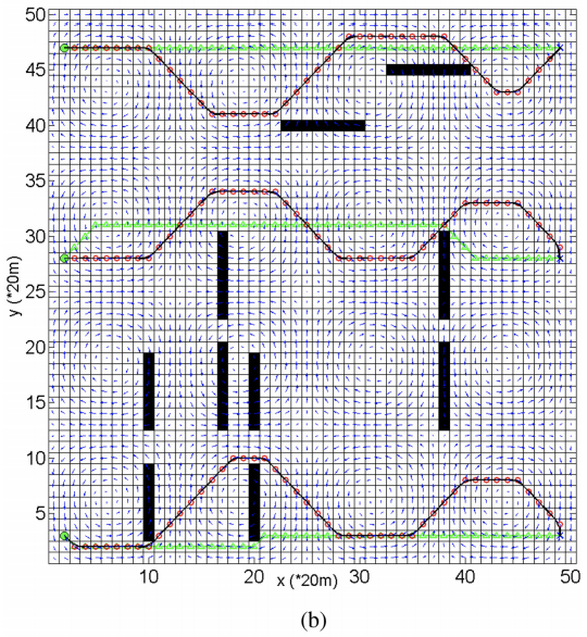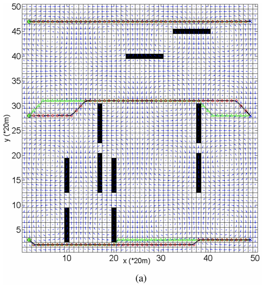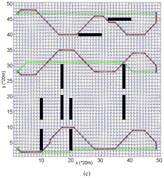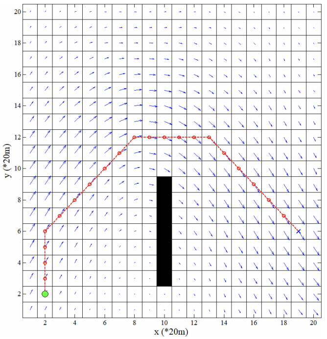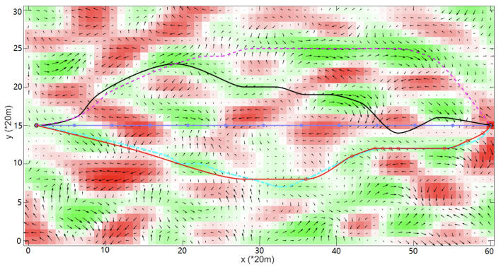 图1展示了在具有障碍物和洋流的二维环境中规划的最小时间成本路径。箭头表示每个网格单位中的洋流速度。箭头越长的表示洋流速度越大。黑色区域代表障碍物。红色部分显然不是最短的距离,但它使AUV在洋流场的帮助下快速到达目的地。