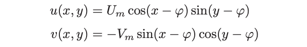 在静态但复杂的空间涡流中,网格(x,y)中的洋流速度表示为(u(x,y),v(x,y)),定义如下: