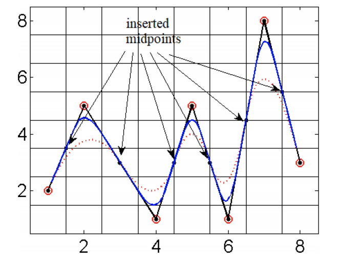 图4 改善路径的中点插入(红色虚线:没有中点插入的曲线;蓝线:有中点插入的曲线)
