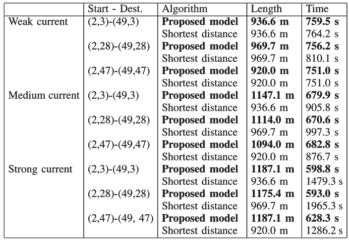 表1显示了所规划的路径的时间和距离成本。在弱洋流环境中,所提出的模型规划的路径与最短距离算法几乎相同。但是,它也延迟了一些转折点,以减少时间成本。中强洋流中的路径与最短路径有很大的不同,它遵循洋流的方向。在中等洋流和强洋流环境中,虽然所提出的模型的距离成本高于最短路径,但可以减少到达时间。并且,洋流越强,所提出的模型的优势就越显著。