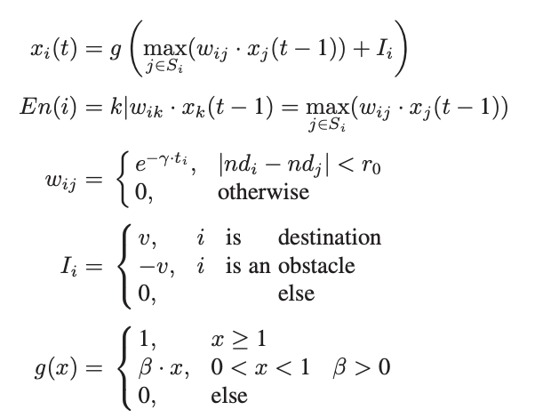 本文基于生物启发式神经网络(BNN)模型的结构,提出了一种新的动态神经网络模型,用来进行路径规划。其中,两个相邻神经元之间的互连接权重是非对称的,并且是各向同性的。神经元仅连接到其感受区中具有最高互神经活动的神经元之一,这被称为“赢者通吃”。