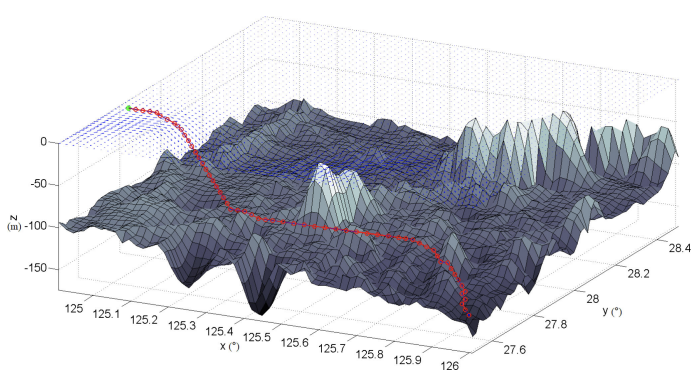 1)涡流环境中的路径规划:在水平面上生成强涡流。使用动态神经网络模型,AUV从绿色圆圈表示的位置开始,到达由蓝色“x”符号表示目的地。规划的路径如图9所示。红色圆圈为动态神经网络模型规划的路径点,红线表示平滑轨迹。AUV利用洋流来节省能量,减少航行时间。规划的路径是安全的,可以避免与海底山脉碰撞。