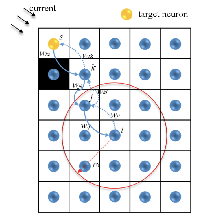 如图2所示,对于到达神经元i的活性值,目标神经元s依次将其活性值传播到神经元k、j和i,然而,有时存在非常强但方向相反的电流,目标神经元的活动不能直接传播到其邻近的一些神经元,那么它将通过迂回传播。