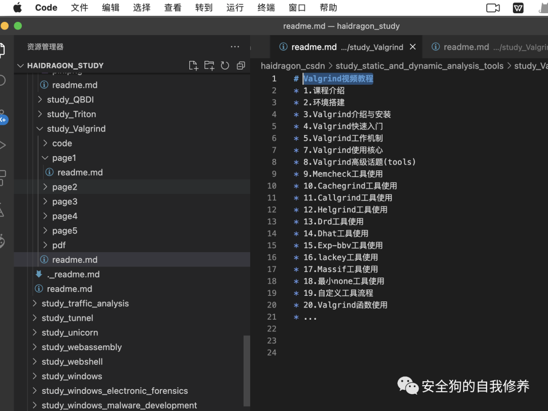 # Valgrind视频教程* 1.课程介绍* 2.环境搭建* 3.Valgrind介绍与安装* 4.Valgrind快速入门* 5.Valgrind工作机制* 7.Valgrind使用核心* 8.Valgrind高级话题(tools)* 9.Memcheck工具使用* 10.Cachegrind工具使用* 11.Callgrind工具使用* 12.Helgrind工具使用* 13.Drd工具使用* 14.Dhat工具使用* 15.Exp-bbv工具使用* 16.lackey工具使用* 17.Massif工具使用* 18.最小none工具使用* 19.自定义工具流程* 20.Valgrind函数使用* ...