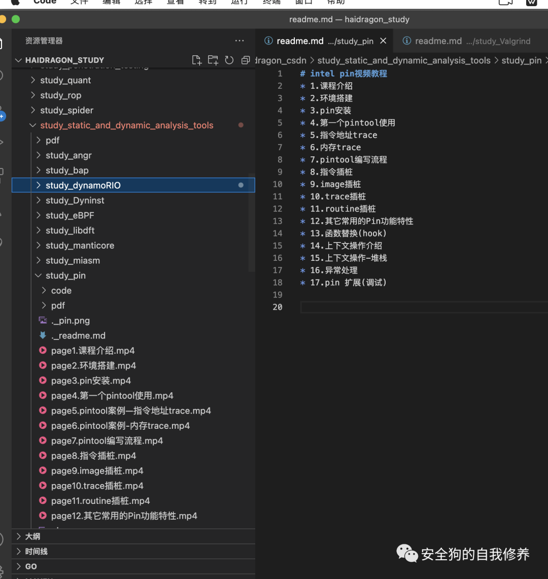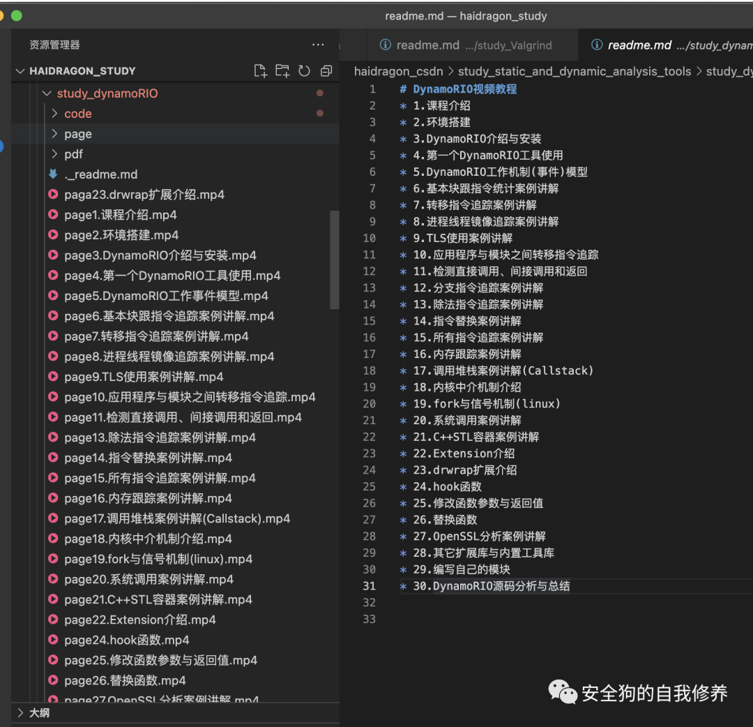 # DynamoRIO视频教程* 1.课程介绍* 2.环境搭建* 3.DynamoRIO介绍与安装* 4.第一个DynamoRIO工具使用* 5.DynamoRIO工作机制(事件)模型* 6.基本块跟指令统计案例讲解* 7.转移指令追踪案例讲解* 8.进程线程镜像追踪案例讲解* 9.TLS使用案例讲解* 10.应用程序与模块之间转移指令追踪* 11.检测直接调用、间接调用和返回* 12.分支指令追踪案例讲解* 13.除法指令追踪案例讲解* 14.指令替换案例讲解* 15.所有指令追踪案例讲解* 16.内存跟踪案例讲解* 17.调用堆栈案例讲解(Callstack)* 18.内核中介机制介绍* 19.fork与信号机制(linux)* 20.系统调用案例讲解* 21.C++STL容器案例讲解* 22.Extension介绍* 23.drwrap扩展介绍* 24.hook函数* 25.修改函数参数与返回值* 26.替换函数* 27.OpenSSL分析案例讲解* 28.其它扩展库与内置工具库* 29.编写自己的模块* 30.DynamoRIO源码分析与总结