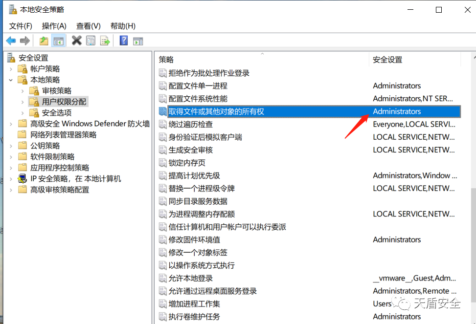 进入“控制面板->管理工具->本地安全策略”,在“本地策略->用户权利指派”。“取得文件或其它对象的所有权”设置为“只指派给Administrators组”。