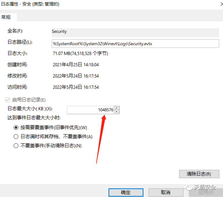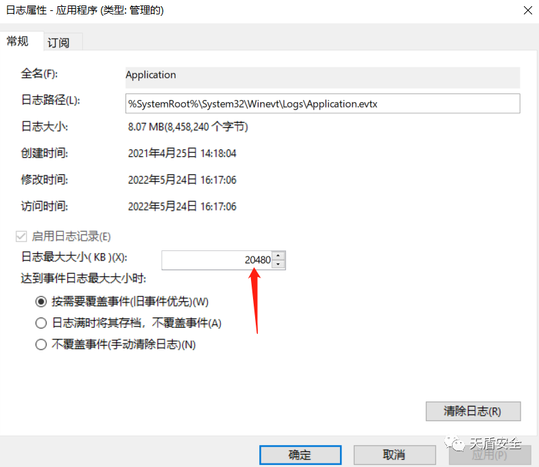 “应用日志”属性中的日志大小设置不小于“8192KB”,设置当达到最大的日志尺寸时,“按需要改写事件”