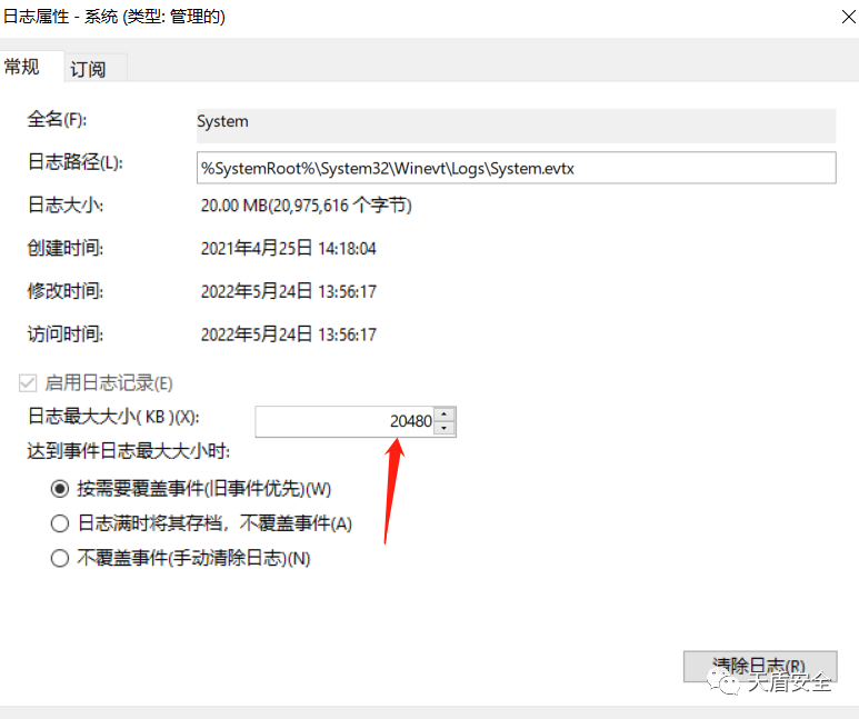 “系统日志”属性中的日志大小设置不小于“8192KB”,设置当达到最大的日志尺寸时,“按需要改写事件”