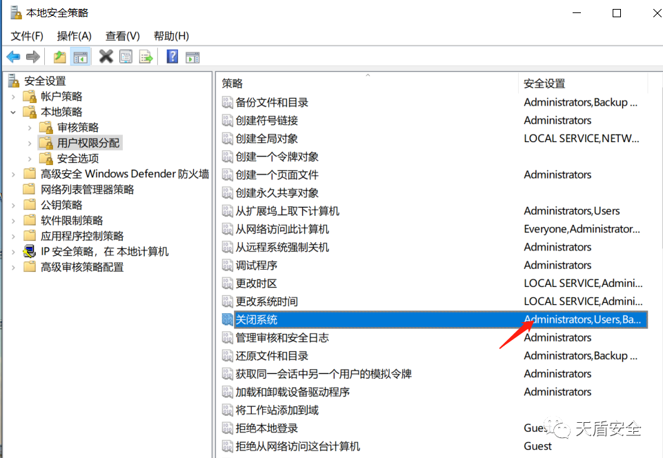 进入“控制面板->管理工具->本地安全策略”,在“本地策略->用户权利指派”。“关闭系统”设置为“只指派给Administrators组”。