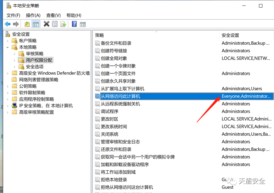 进入“控制面板->管理工具->本地安全策略”,在“本地策略->用户权利指派”,“从网络访问此计算机”设置为“指定授权用户”。
