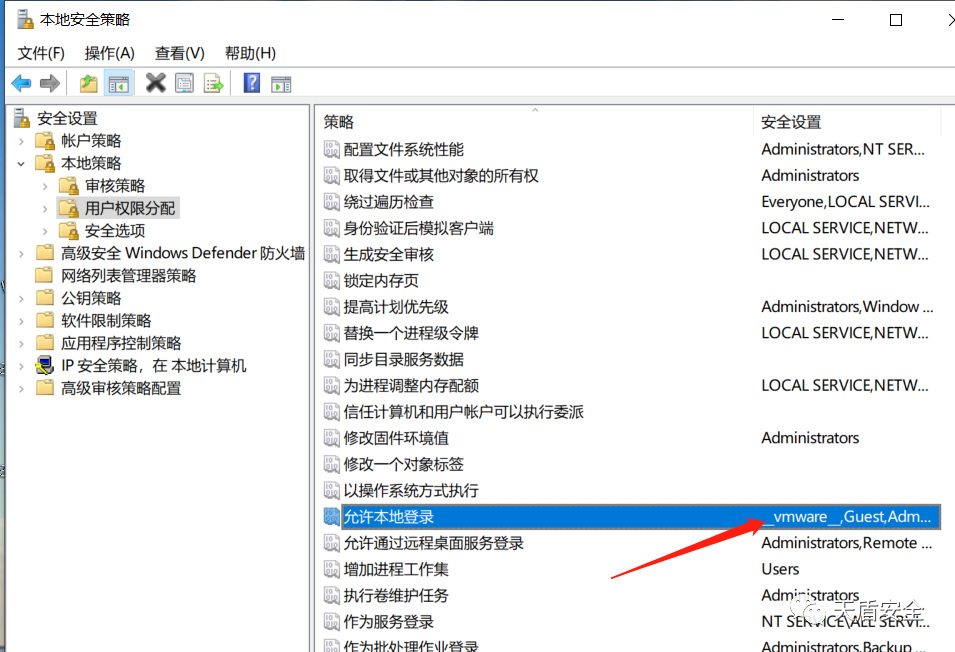 进入“控制面板->管理工具->本地安全策略”,在“本地策略->用户权利指派”,“从本地登录此计算机”设置为“指定授权用户”。