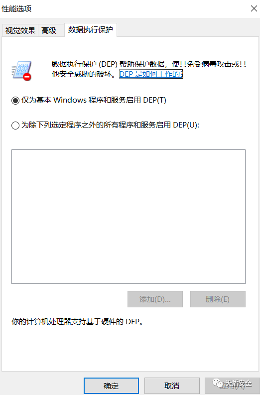 进入“控制面板->系统”,在“高级”选项卡的“性能”下的“设置”。进入 “数据执行保护”选项卡。设置为“仅为基本 Windows 操作系统程序和服务启用DEP”。