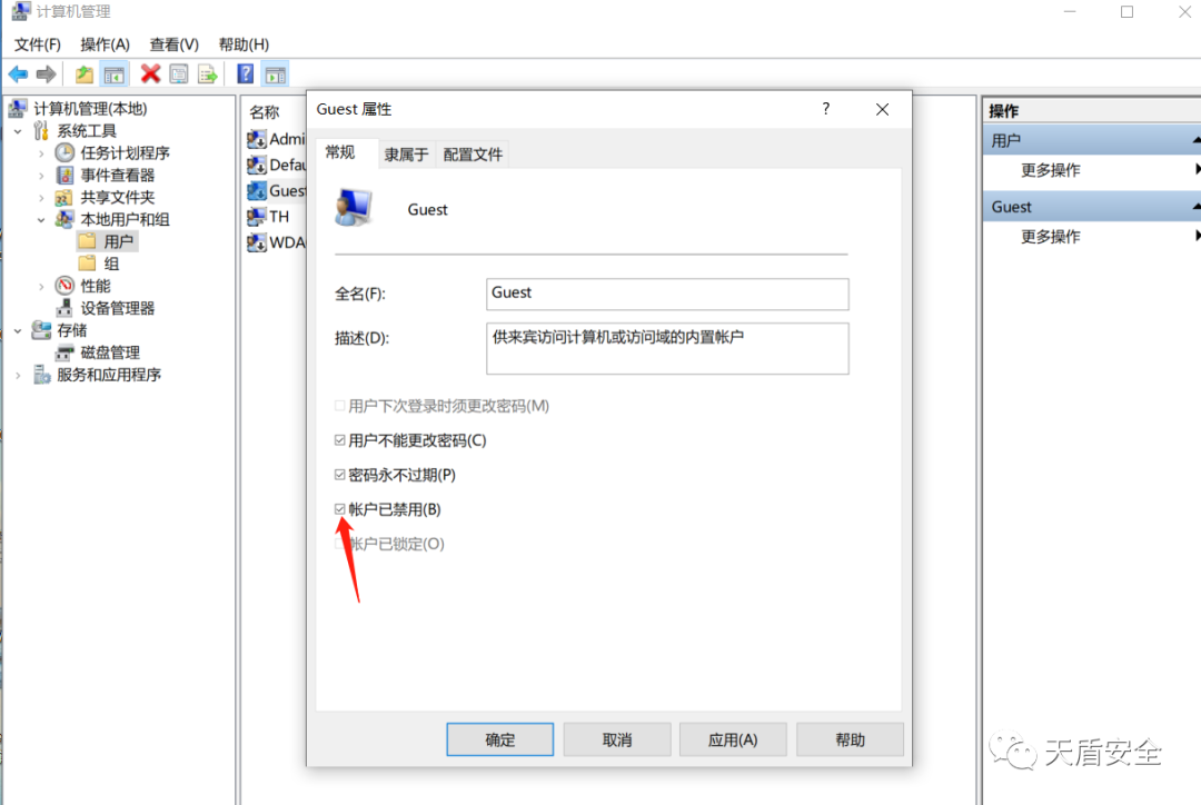 3、更改缺省账户名称;禁用guest(来宾)账号: