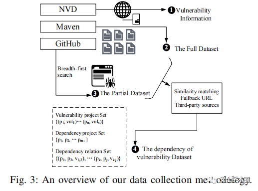 挑战 项目的构建文件只提供分离的依赖关系,需要遍历项目重用库中的构建文件才能获得完整的依赖关系。 解决:将依赖关系分为 Full/Whole Dataset (Maven) 和 Partial Dataset (GitHub) 两类 如何整合不同来源数据集(NVD、Maven、GitHub)的信息来判断项目是否存在漏洞。 方法 A.数据收集