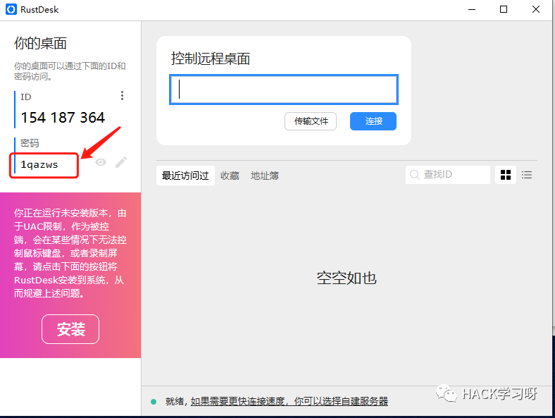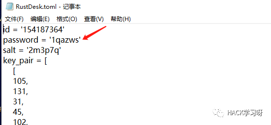 (2)不知道是不是RustDesk的bug还是出于安全考虑,如果是第一次在目标上运行RustDesk,RustDesk不会立即将密码保存到配置文件,而此时你把鼠标放在显示密码时则会保存到文件,遇到这种情况我们只需运行RustDesk,生成配置文件后结束RustDesk进程,然后修改配置文件里password为指定密码,再运行RustDesk即可。