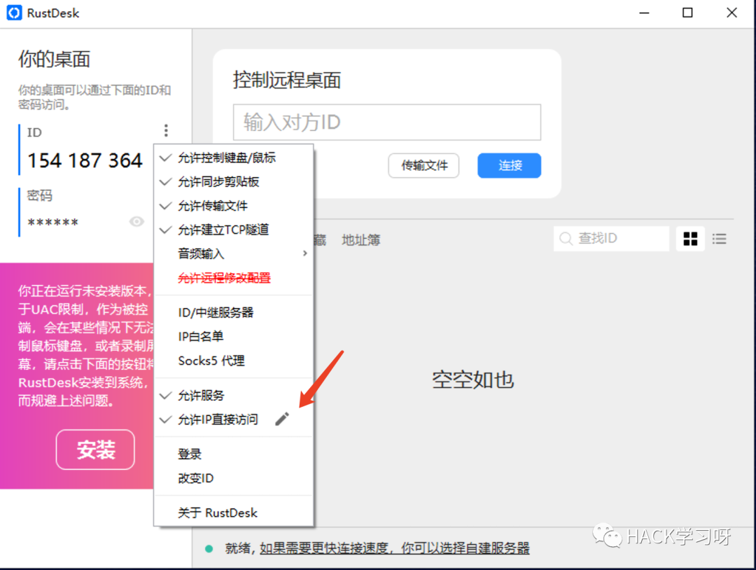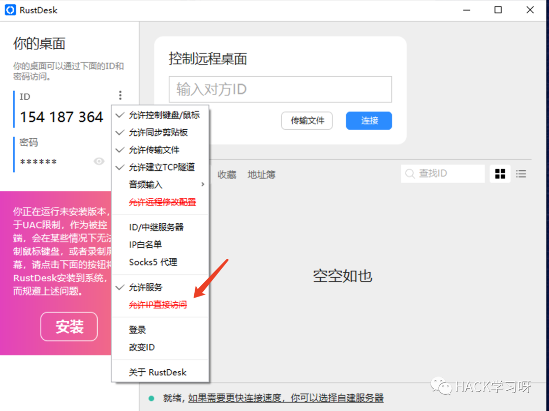 在RustDesk默认设置中,允许IP直接访问功能未开启,如下图: