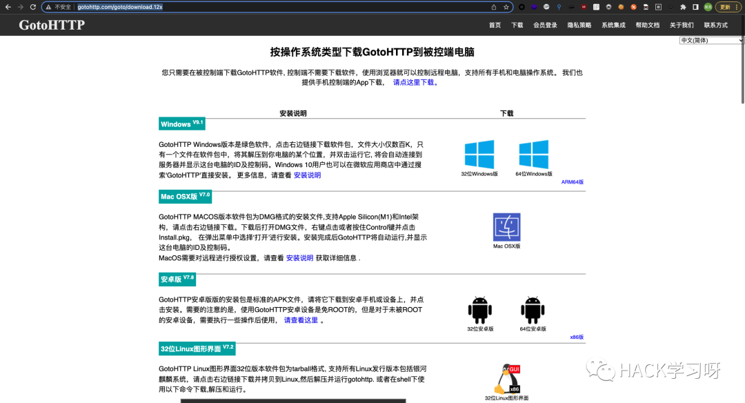 GoToHTTP提供了多种系统的被控端,可以根据情况选用。